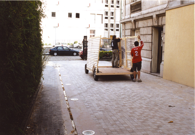 Bois, Polycarbonate onduline, pneus et résine. Diffusion de la vidéo : Fait main